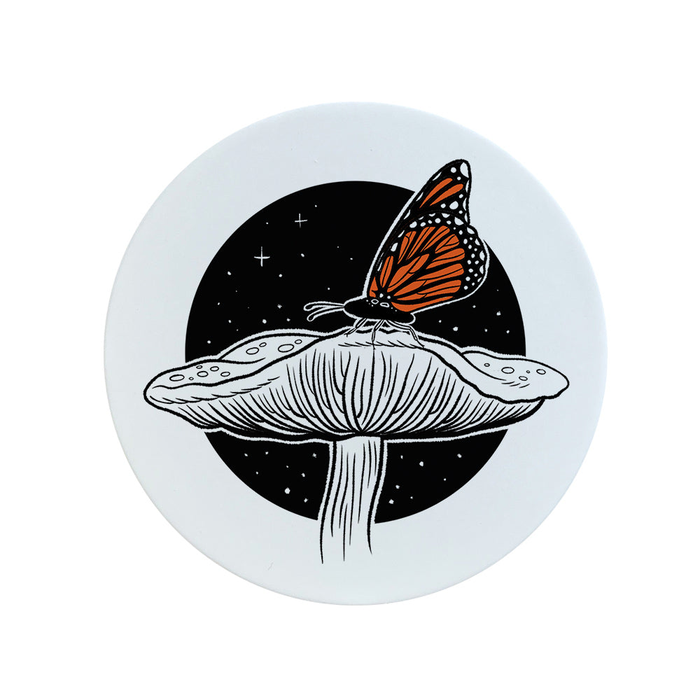 Add a touch of nature to your home with the Fungi Friends collection. This coaster features a starry night sky with a beautiful butterfly settled on a mushroom.